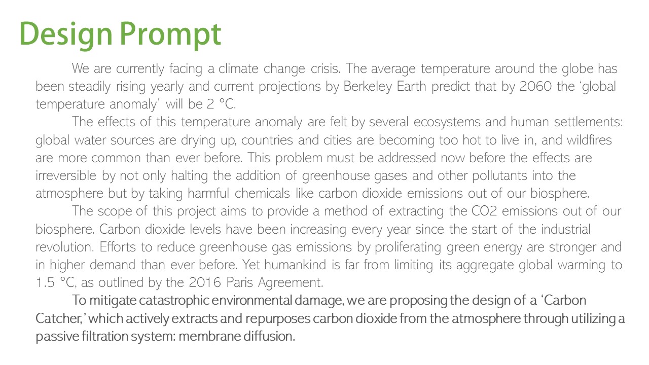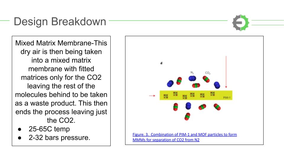I was partnered with two Chemical Engineering students and one Biomedical Engineering student. With the goal of filtering carbon dioxide from the air for carbon storage, my group and I made sure our membrane design had high selectivity estimating the cost based on real-world parts to make it cost-efficient compared to our competitors. Based on these requirements, I suggested to my group that our membrane structures should be based on composite structures following a mixed matrix membrane (MMM's). This means we could tailor the membrane to be very selective towards the carbon where that is the only element running through it while anything else is left behind. Below is a general schematic of how the Carbon Catcher would proceed into the membrane making it the most efficient. The following slides illustrate the detailed process of how this MMM is implemented into the machine and relating it to industry standards.