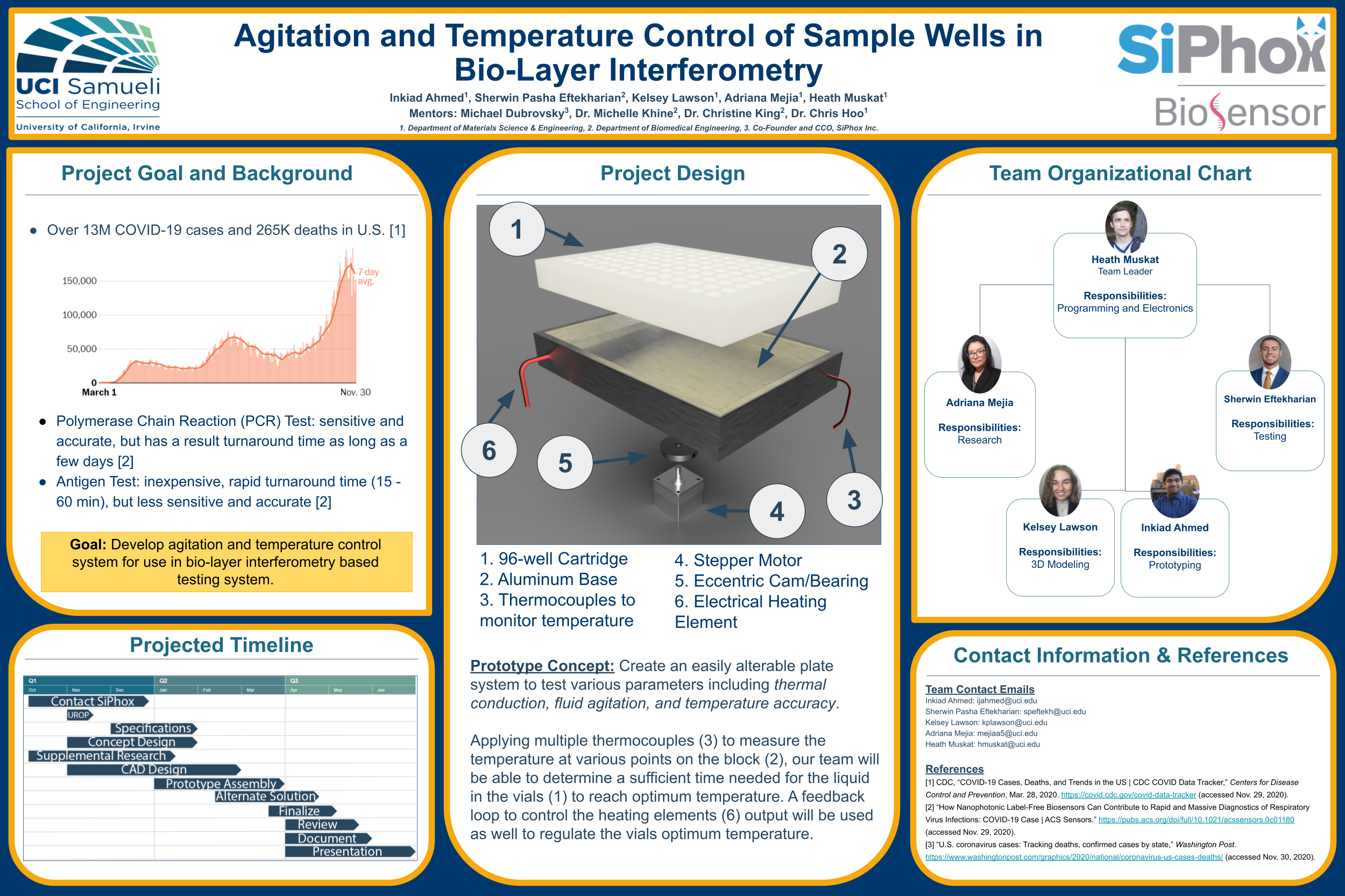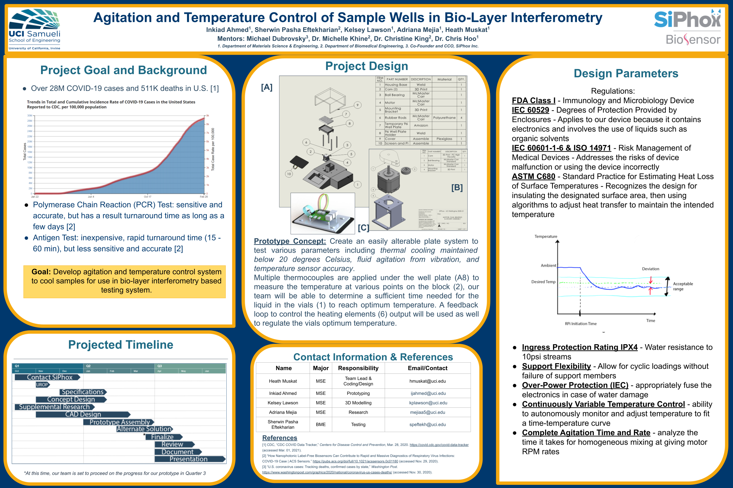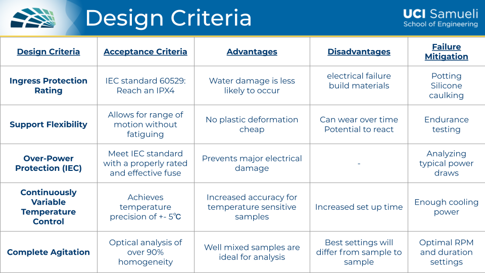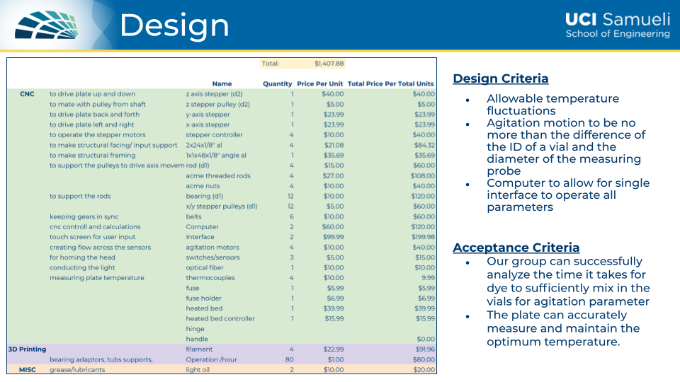 The physical components required by Michael were to design an easily alterable prototype to test various biological parameters through thermal conduction, fluid agitation, and temperature accuracy. The idea was that our prototype design is the first phase of the device and would eventually undergo more complex parameters such as adding bio-layer interferometry (BLI) to correctly analyze the biological samples. This first quarter of researching and figuring out our design approach is shown in my teams’ first poster and presentation below.