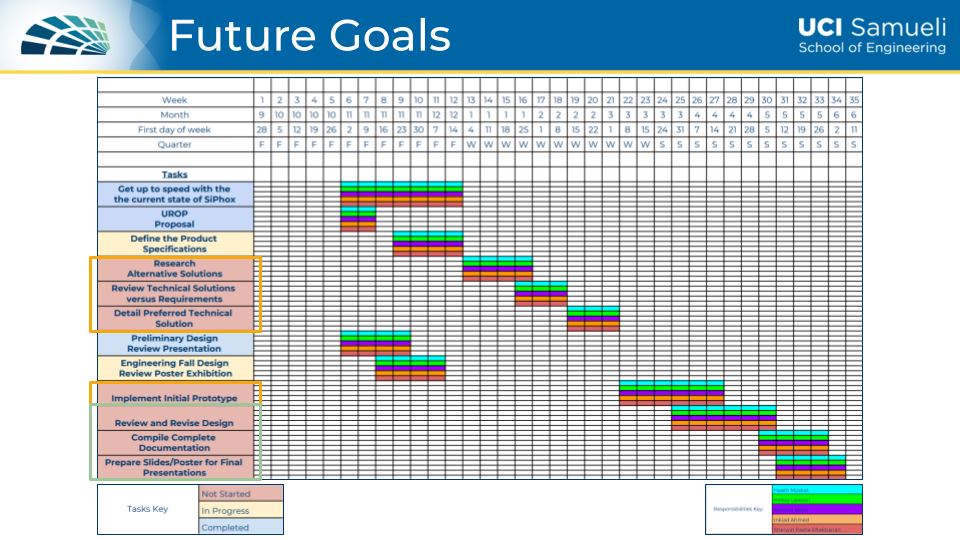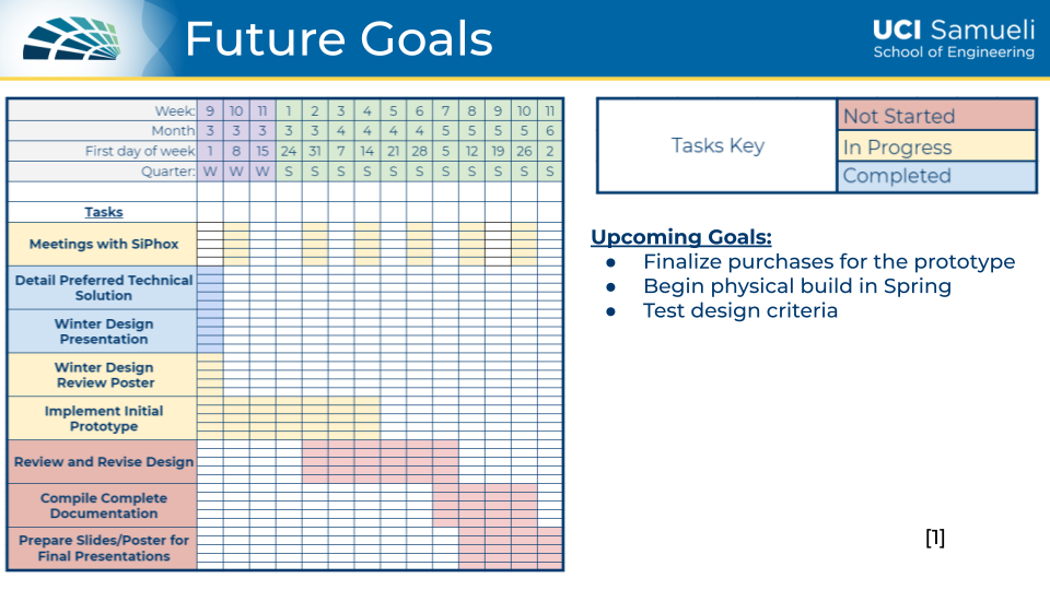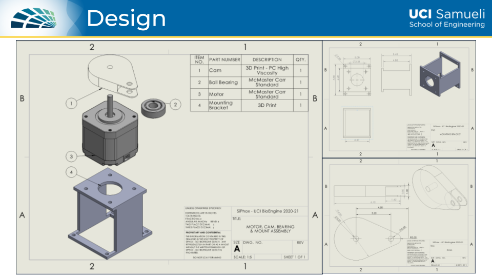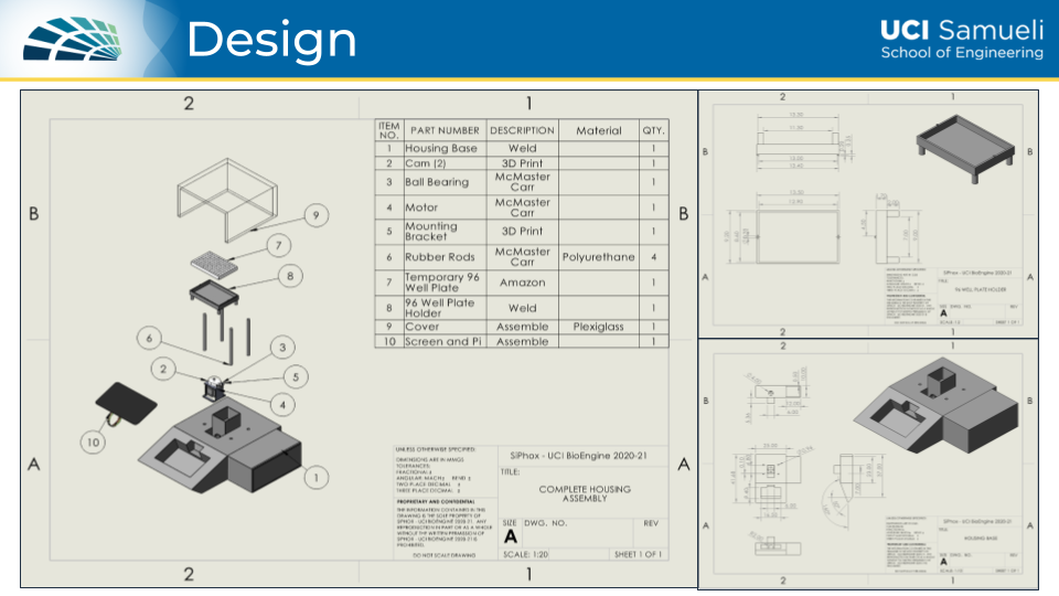 Throughout Winter Quarter I was responsible for completing the 3D model of the entire chassis and subcomponents using SolidWorks. I had also designed and updated our website about our intentions working alongside SiPhox. Our design concept is seen in our second poster below. The goal we had set up was to start building our prototype by the end of the quarter. However, due to processing and shipping delays, all of the parts ended up coming late. This pushed our deadline to assemble the prototype late into Spring Quarter.